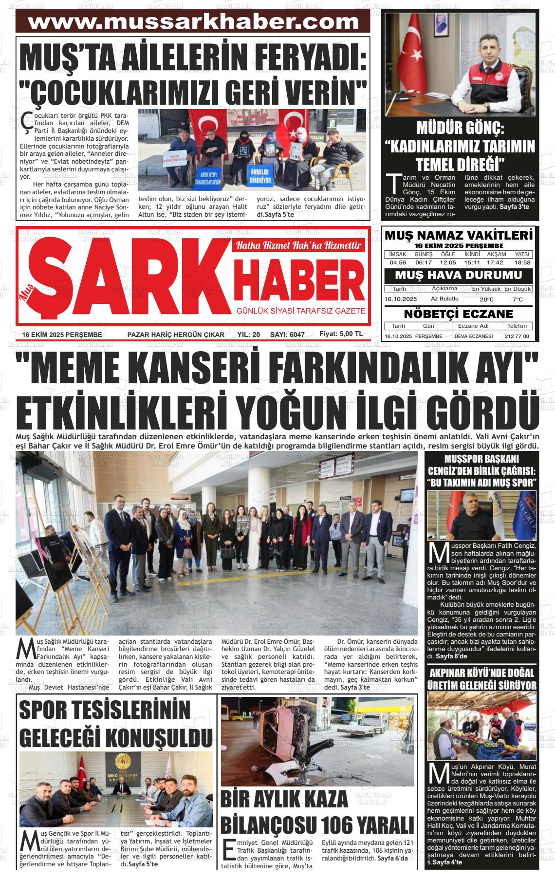 Muş Yerel Gazeteleri 17 Ekim 2025, Cuma Günü Manşeti