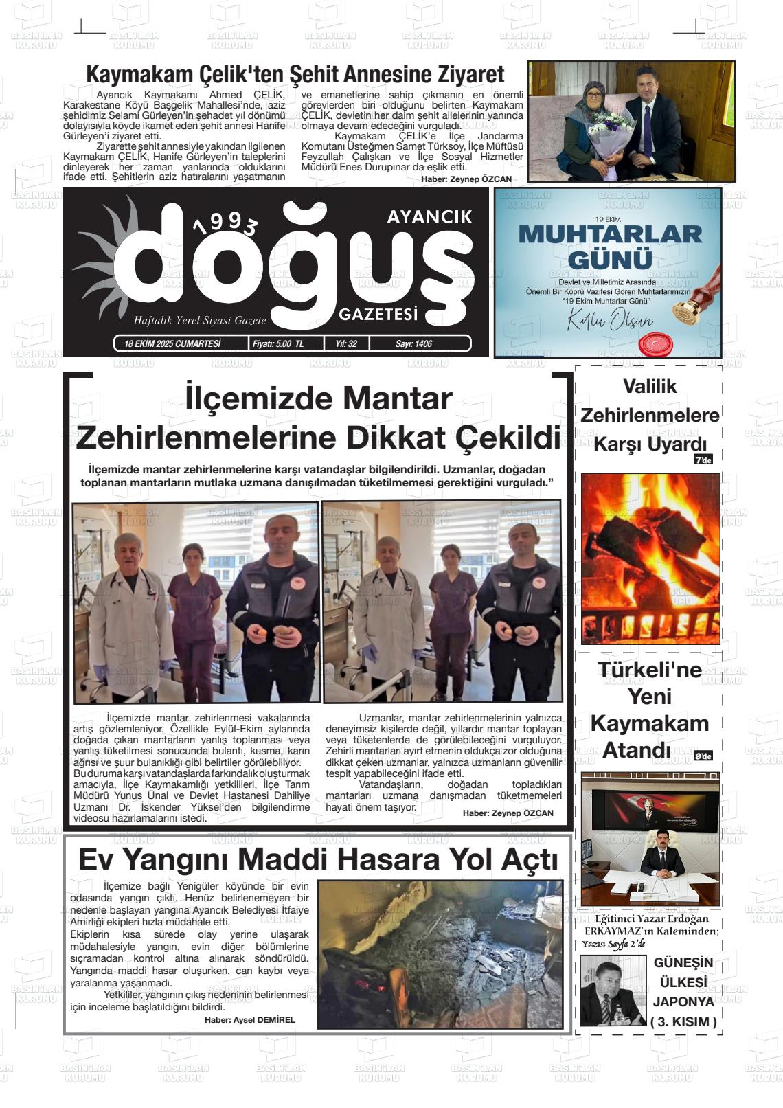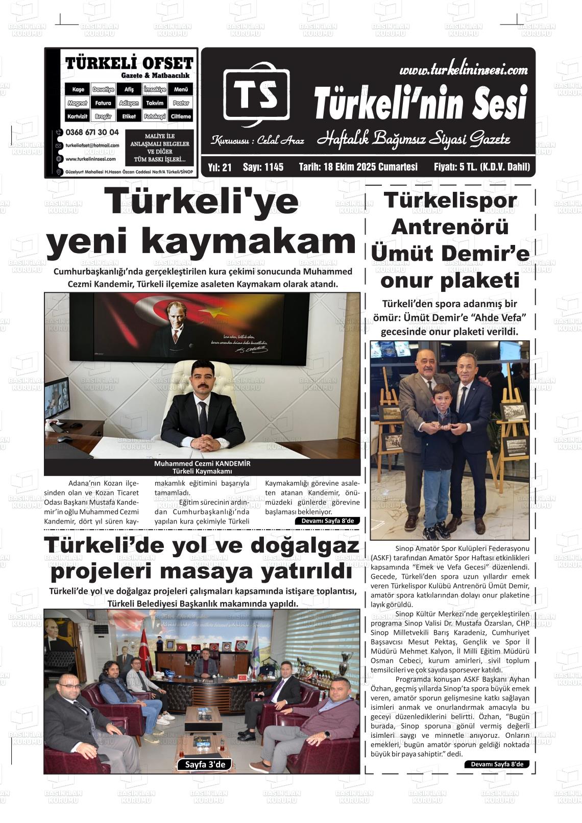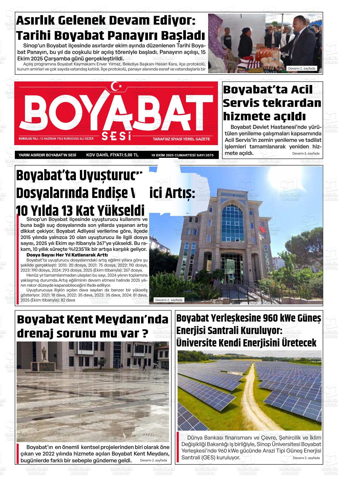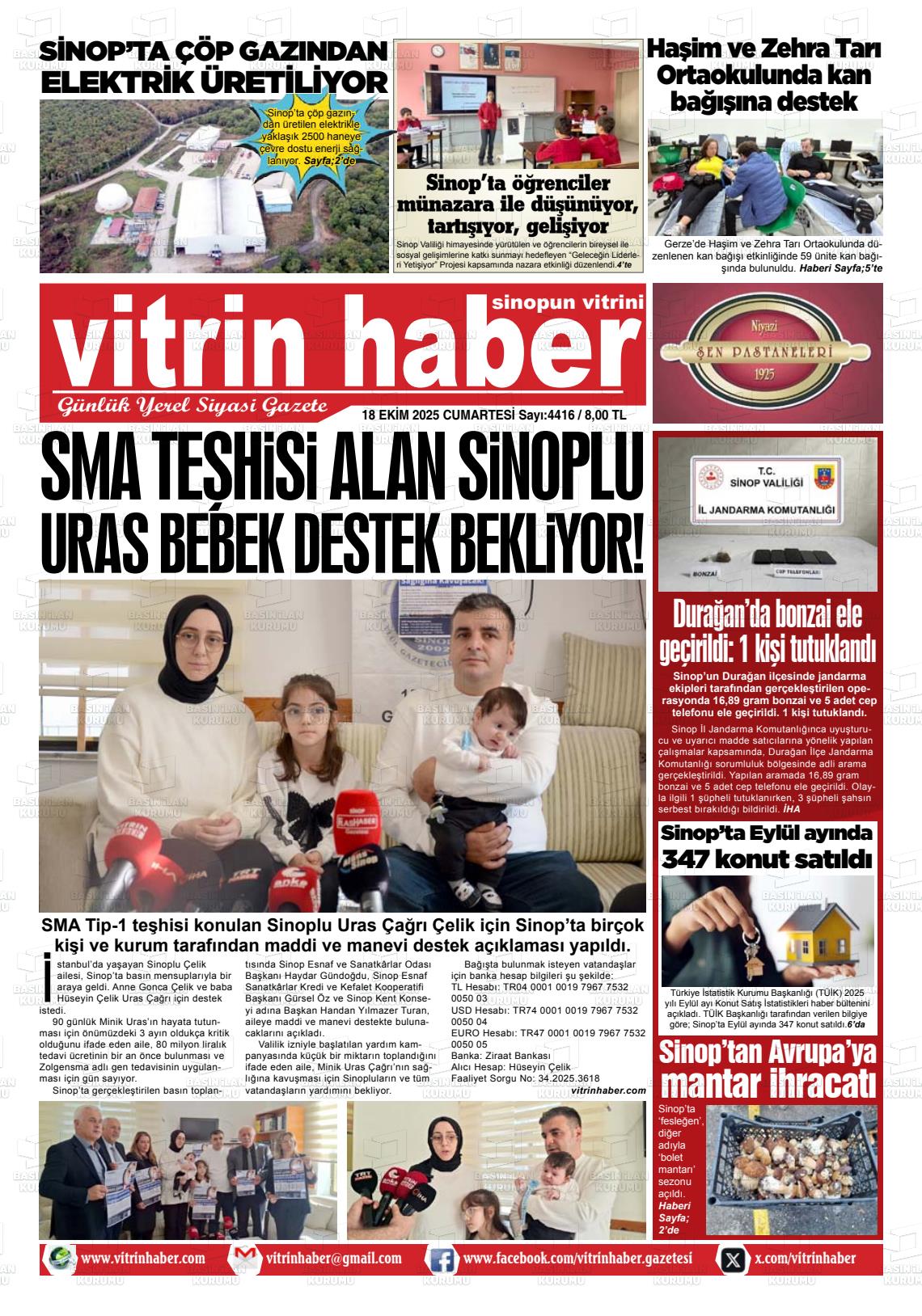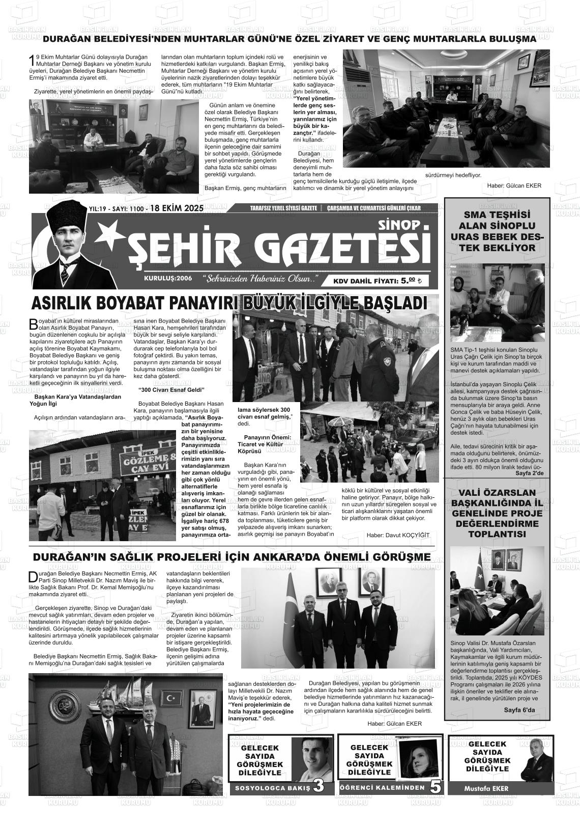 Sİnop Yerel Gazeteleri 18 Ekim 2025, Cumartesi Günü Manşeti